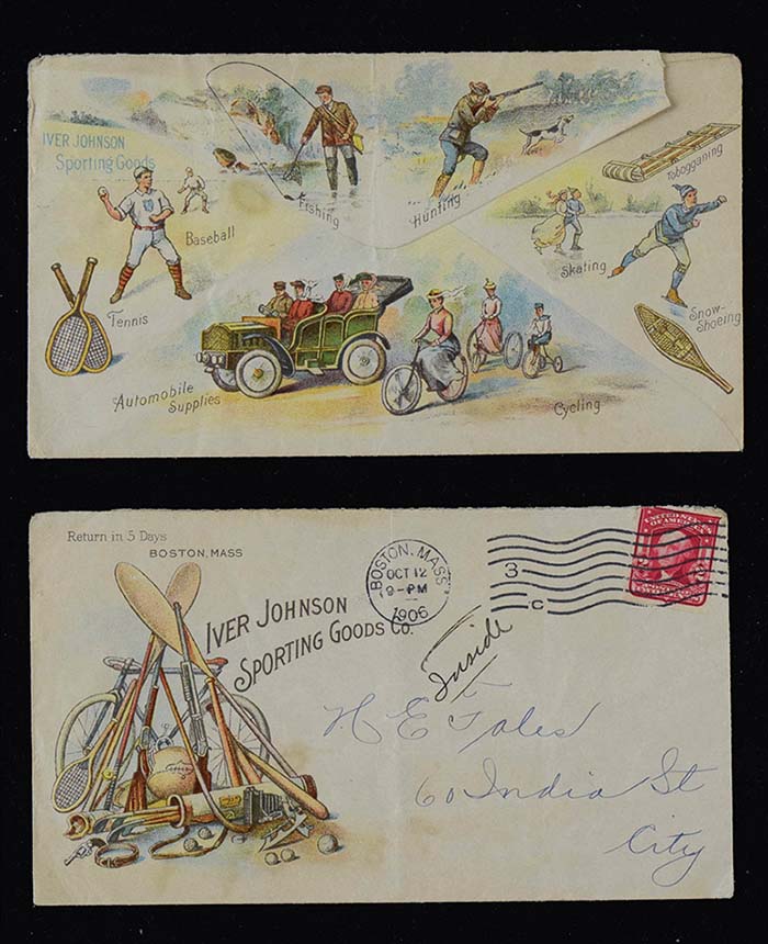 Description:Iver Johnson Sporting Goods advertising cover with mixed sport illustrations incl. baseball (VG-EX) Beautifully done, postmarked 1906, and illustrated on front with a mixture of sporting equipment. Back has scenes of baseball, fishing, hunting, skating, tobbaning, snow-shoeing, cycling, tennis, and automobile. Light scattered wear and toning. Opened along the top with flap attached to back missing a small end piece: VG-EX