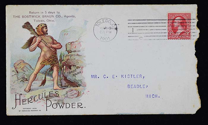 Description:1901 Hercules Powder advertising cover (VG-EX) Nicely illustrated on front with additional design on back. Postmarked 1901 with some natural handling wear. Torn open at right edge (jagged with some discoloration): VG-EX