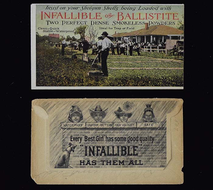 Description:Infallible smokeless powders advertising covers (2) (EX/MT and see description) Includes unused color illustrated "Infllible or Ballistite" cover which has a hint of wear and very light toning; additional envelope which has oversized illustrated flap on back. The flap has separated but can be positioned for display. Envelope otherwise shows some mild toning and scattered wear/chipping along with some penicl notations: EX/MT and see description