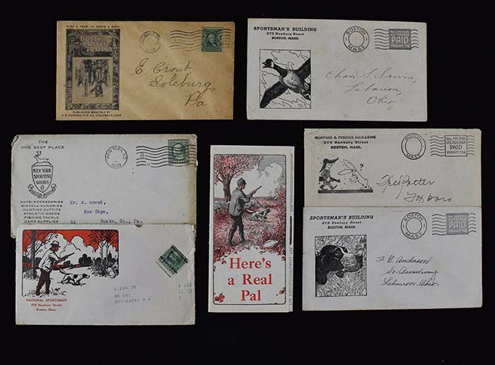 Description:Nice lot of (6) Sporting publication, retailer, or similar advertising covers/envelopes c.1900s-20s (GD-EX) Includes 1908 postmarked "Hunter Trader Trapper" advertising cover; nicely illustrated "National Sportsman" cover which contains a lengthy advertising brochure, subscription offer slip, return envelope, and additional advertising sheet; 1909 postmarked "New York Sporting Goods Co" cover; (2) "Sportsman's Building" covers (both postally used, undated) with (1) have dog illustration and the other a fowl; and "Hunting & Fishing Magazine" illustrated cover (postally used, undated). Varying degrees of wear throughout: GD-EX
