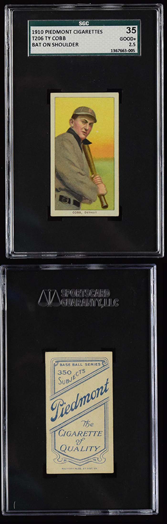 Description:1909-11 T206 Ty Cobb (Bat on shoulder), well centered with striking EX/MT or better apperance (SGC 35 Good+) Exceptional example of one of the most desirable cards in the lauded T206 set displays a very strong EX/MT appearance with crisp and well centered image. Encapsulated by SGC with assigned technical grade of (35 Good+) due to what they consider to be glue (or other foreign substance) on the back: SGC 35 Good+ ($1,000+)