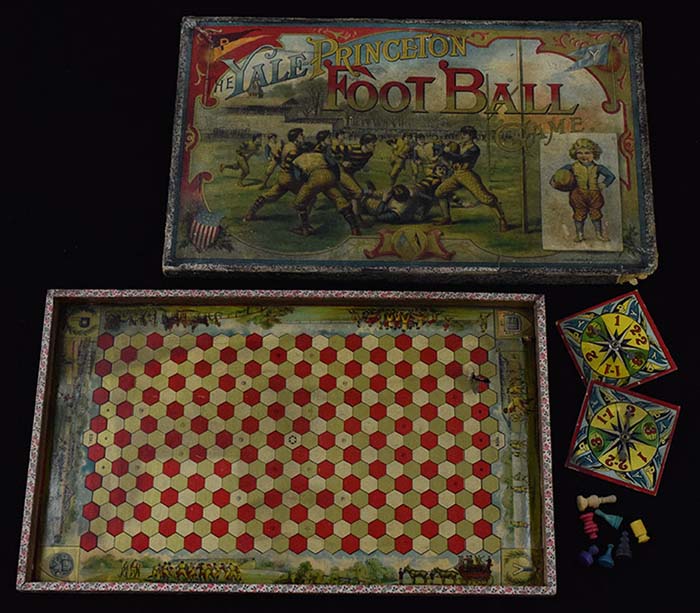 Description:"The Yale-Princeton Football Game" by McLoughlin Bros. c.1895 (VG-EX) Choice display item features a color lithographed lid with a game action scene that is marked, "1895 by McLoughlin Bros." at lower right. Lid has some chipping and small tears along side skirts which are missing a corner and may have some glue added to regain shape. Central portion is lightly soiled and the upper corners have damage that has possibly likewise been reversed. Playing board retains bright coloration with some wear and light wrinkling. Includes a pair of spinners and some wooden playing pieces: VG-EX ($750-$1,000)
