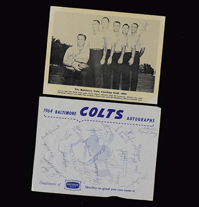 Description:1964 Baltimore Colts team signed autograph sheet, plus coaching staff multi-signed photograph (VG/EX-EX). Includes approx. 8"x10" 1964 Colts coaching staff photo signed by (5) including Don Shula, Bill Arnsparger, Dick Bielski, John Sandusky, and Don McCafferty (EX, age toning); and 8.5"x11" autograph sheet signed by (20) including Don Shula, Johnny Unitas, Jim Parker, Raymond Berry (personalized), Bob Boyd, Jim Orr, Steve Stonebreaker, Alex Sandusky, Neal Petties, and others (VG/EX, minor crinkling, edge wear). Signatures rate 6/7 to 10 (avg 8/9) out of 10: VG/EX-EX
