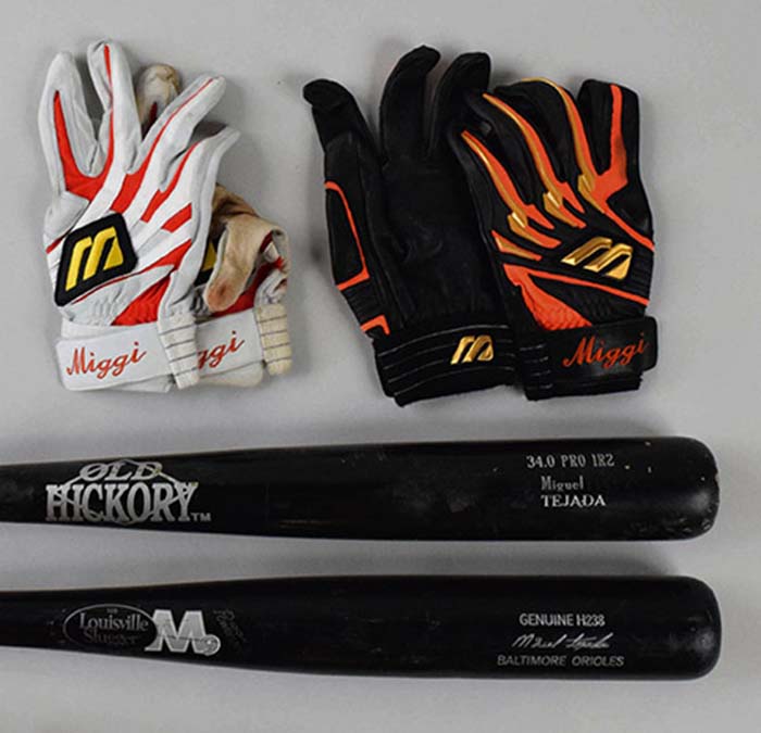 Description:Lot of (2) Miguel Tejada professional model baseball bats and (6) Batting gloves (VG-EX/MT). Incl. c.2004-07 34" Louisville Slugger H238 Miguel Tejada professional model bat with number "10" written on the knob in silver marker (VG, heavy use, cracked, ball marks, seam impressions, taped knob); c.2004-07 34" Old Hickory PRO IR2 Miguel Tejada model bat (EX, strong use, ball marks, pine tar residue); and (6) c.2004-07 Mizuno professional model Miguel Tejada batting gloves with "Miggi" embroidered on each wrist strap (EX-EX/MT, various degrees of wear). Range: VG-EX/MT