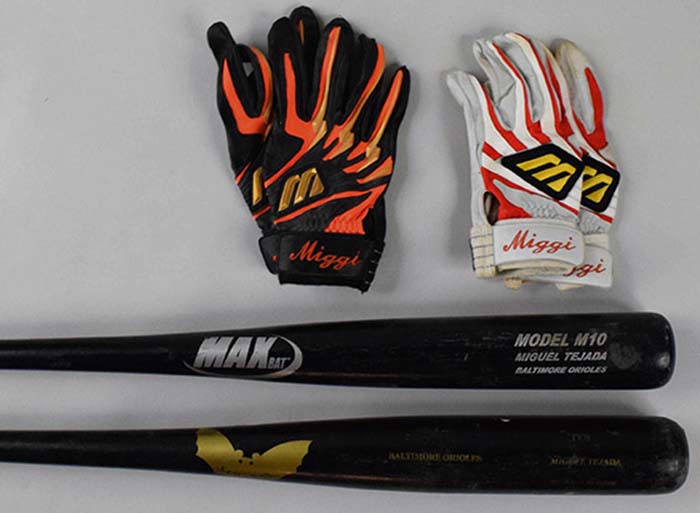 Description:Lot of (2) Miguel Tejada professional model baseball bats and (7) Batting gloves (VG-EX/MT). Incl. c.2004-07 34" MAX BAT M10 Miguel Tejada model bat with "34/32" length/weight written on the cupped end in silver marker (VG, heavy use, ball marks, pine tar residue, taped knob, handle crack); 2007 SAM BAT TY'S Miguel Tejada model bat with specifications written on the cupped end and number "6" written on the knob likely indicating that Melvin Mora also used the bat (VG/EX, strong use, ball marks, pine tar residue, hairline handle crack); and (7) c.2004-07 Mizuno professional model Miguel Tejada batting gloves with "Miggi" embroidered on each wrist strap (EX-EX/MT, various degrees of wear). Range: VG-EX/MT
