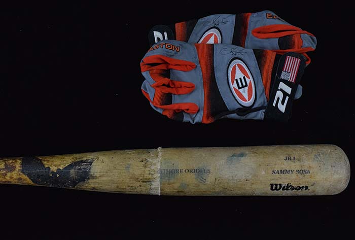 Description:2005 Sammy Sosa professional model baseball bat plus pair of batting gloves (VG-EX/MT). 34.5" Wilson JB1 Sammy Sosa model bat with specifications written on the end of the bat (VG, heavy use, cracked, ball marks, spike marks, taped knob/handle, heavy pine tar residue); and pair of Easton professional model Sammy Sosa batting gloves with number "21" and American flag embroidered on the left glove and number "21" and Dominican Republic flag embroidered on the right glove (EX-EX/MT, light pine tar residue). Range: VG-EX/MT