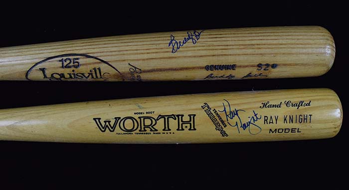 Description:Buddy Bell and Ray Knight signed professional model baseball bats, c.1980-87 (VG/EX-NM). incl. c.1980-83 34.5" Louisville Slugger S2 Buddy Bell model bat with number "25" written on the knob in black marker, and signed on the barrel by Bell in blue marker (EX/MT-NM, minimal wear); and 1987 34" Worth WC126RK Ray Knight model bat with number "25" written on the knob in black marker, and signed on the barrel by Knight in blue marker (VG/EX, ball marks, light pine tar residue, small crack at top of handle). Signatures rate 8/9 to 9 out of 10: VG/EX-NM