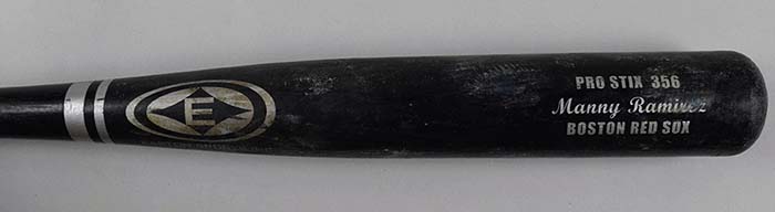 Description:Manny Ramirez professional model baseball bat, c.2001-04 (VG). 34" Easton Pro Stix 356 Manny Ramirez model bat showing excellent use with ball marks covering the barrel, light pine tar residue, and a large handle crack: VG