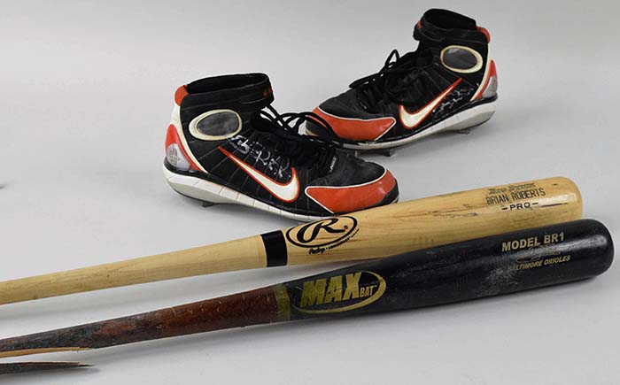Description:Pair of Brian Roberts signed professional model spikes, plus (2) pro model bats (GD-EX). Incl. c.2005 Nike size 9.5 spikes with "B ROB" embroidered on both straps and number "1" on each heel, Roberts signed both in silver marker rating 6 to 7/8 out of 10 (EX, used, soil residue); c.2000s 33" MAX Bat BR1 Brian Roberts model bat (GD, heavy use, ball marks, pine tar residue, large crack); and 2005 33" Rawlings-Adirondack MMM06 Brian Roberts model bat (EX, ball marks). Range: GD-EX