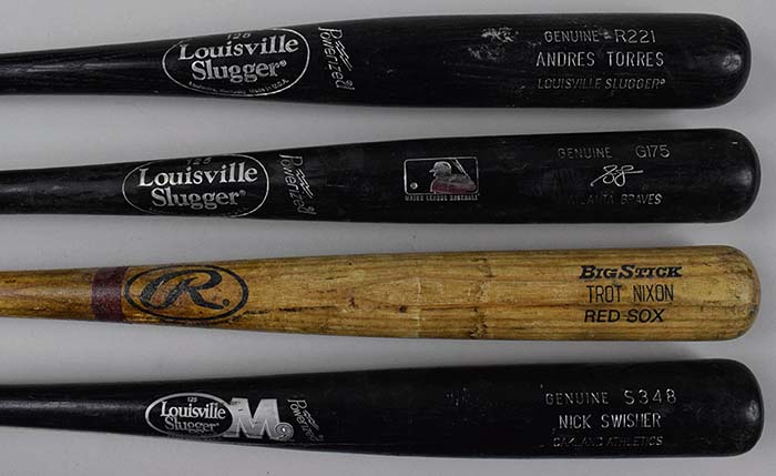 Description:Lot of (7) professional model baseball bats, c.1999-2007 (GD-EX). Incl. c.1999-01 34" Louisville Slugger G175 Andruw Jones model bat (VG-VG/Exm cracked); 2001 34" Rawlings-Adirondack 225B Gerald Williams model bat (VG, cracked); c.2001-02 33" Louisville Slugger R221 Andres Torres model bat (VG/EX-EX, strong use, heavy grain swelling); c.2001-08 34" Louisville Slugger S329 Paul Konerko model bat (VG, cracked); 2002 35" Rawlings-Adirondack 693A Trot Nixon model bat (EX, strong use, pine tar residue); 2003 34" Louisville Slugger G175 Rey Sanchez model bat (VG, cracked); and c.2004-07 33.5" Louisville Slugger S348 Nick Swisher model bat (GD, large crack). Range: GD-EX