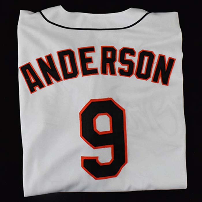 Description:1999 Brady Anderson professional model Baltimore Orioles jersey with Ripken Sr. memorial patch (EX/MT). Russell Athletic MLB Authentic Diamond Collection size 48 jersey with "Orioles" and number "9" sewn on the front, along with "ANDERSON" and number "9" sewn on the back. "7" Cal Ripken Sr memorial patch is sewn on the right sleeve, and Orioles logo patch is sewn on the left sleeve. "1999" year tag and Russell Athletic tagging is on the front tail with 100% Polyester, 2" Extra Length, and Tapered Body flag tags. Displays light overall use/wash wear: EX/MT