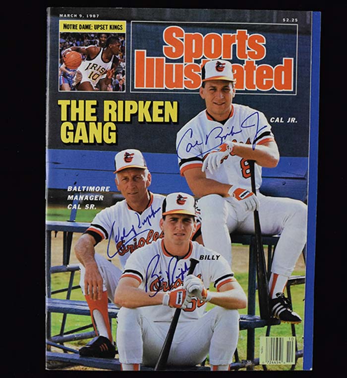 Description:Cal Ripken Sr., Cal Ripken Jr., and Billy Ripken multi-signed 1987 Sports Illustrated (NM). March 9th 1987 Sports Illustrated signed on the cover by all three in blue marker. Signatures rate 9 to 10 out of 10: NM