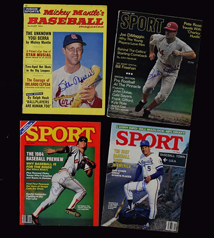 Description:Stan Musial, George Brett, Cal Ripken Jr., Pete Rose signed publications from 1962-1986 (EX-NM). Incl. Aug 1962 "Mickey Mantle's Baseball Magazine" signed by Stan Musial (EX); Aug 1968 Sport signed by Pete Rose (EX-EX/MT); April 1984 Sport signed by Cal Ripken Jr (NM); and May 1986 Sport signed by George Brett (NM). Signatures rate 8/9 to 10 out of 10: EX-NM
