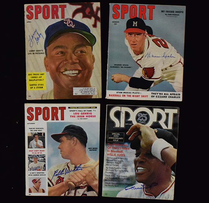 Description:Warren Spahn, Larry Doby, Eddie Mathews, Willie Mays signed publications from 1953-1971 (VG/EX-EX/MT). Incl. Aug 1953 Sport signed by Warren Spahn (VG/EX-EX); April 1956 Sport signed by Larry Doby (EX); Sept 1958 Sport signed by Eddie Mathews (EX-EX/MT); and Sept 1971 Sport signed by Willie Mays (EX/MT). Signatures rate 8/9 to 10 out of 10: VG/EX-EX/MT
