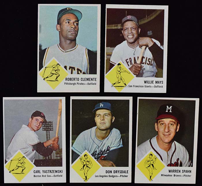 Description:Very sharp 1963 Fleer baseball complete set of (66) with nearly all NM (Avg. NM with good number NM/MT and very few lesser) Very sharp set with nearly all cards in "pack fresh" NM condition and only a handful which would need upgrading. Keys: #4 Robinson (VG/EX OC), 5 Mays (NM/MT OC), 8 Yastrzemski (NM OC), 22 Kaat (NM), 32 Santo (EX/MT-NM), 41 Drysdale (NM OC), 42 Koufax (EX/MT), 43 Wills (NM OC), 45 Spahn (NM OC), 46 Adcock (VG/EX-EX), 56 Clemente (NM/MT OC), 59 Mazeroski (NM with some wax stains on back), 61 Gibson (EX/MT), 64 Cependa (NM/MT with some very light wax stains on back): Avg. NM with good number NM/MT and very few lesser ($400-$600)