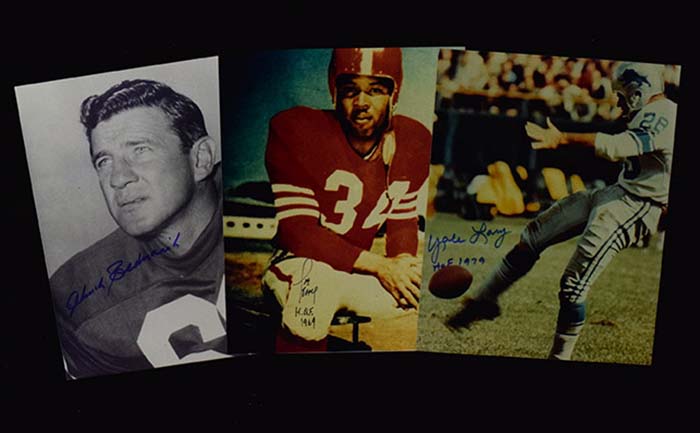 Description:Lot of (22) Chuck Bednarik, Joe Perry, and Yale Lary signed 8"x10" photographs (NM-NM/MT). Includes (7) Chuck Bednarik signed photos, (11) Joe Perry signed photos, and (4) Yale Lary signed photos with "HOF 1979" inscription added to each. Signatures rate 8 to 10 out of 10: NM-NM/MT