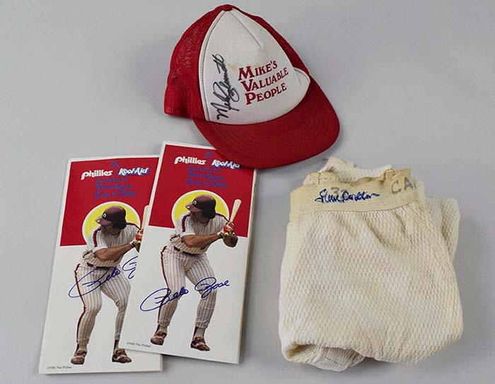 Description:Mike Schmidt, Steve Carlton, and Pete Rose autograph lot including Carlton signed undershorts (VG/EX-NM/MT). Incl. c.1970s undershorts with vintage "CARLTON 32" written on the waist in black marker, and signed by Carlton in blue marker (VG/EX, heavy use); (2) 1986 Phillies Salute to Pete Rose fold-outs both signed by Rose in blue marker; and "Mike's Valuable People" hat signed by Mike Schmidt (EX, light stains). Signatures rate 8 to 10 out of 10: VG/EX-NM/MT