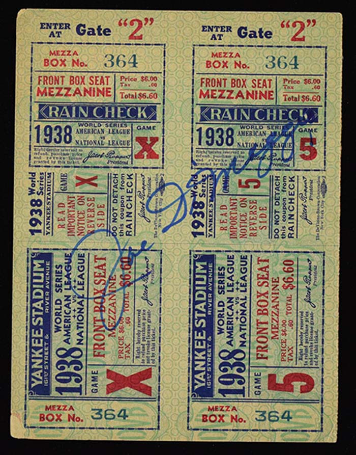 Description:Joe DiMaggio autographed 1938 World Series ticket pair of (2) uncut (full JSA LOA) (Sig. NM, Tickets EX) Pair of 1938 World Series which remain attached in uncut form having Gmae (5) and Game (X) designations. Signed in marker rating 8 out of 10. Touch of light wear wear with chip at upper left corner and small piece of vintage tape on back upper right. Includes full LOA from JSA: Sig. NM, Tickets EX ($300-$500)