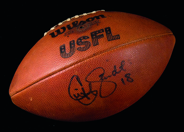 Description:March 11, 1984 Birmingham Stallons vs. Pittsburgh Maulers USFL game ball autographed by Cliff Stoudt and Rollie Dotsch (EX) Wilson brand Chet Simmons model Official USFL football bears faint period handwritten side panel notation reading "1984 BH-S-30 - M-18." Signed by Gold Rollie Dotsch and quarterback Cliff Stoudt whom was making a return to Pittsburgh after his lengthy career as backup to Terry Bradshaw. Marker signatures rate 8 out of 10. Light to moderate evident useage wear. Includes auction LOA from JSA and letter of provenance from family of the original recipient: EX ($300-$500)