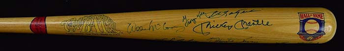 Description:"Hall of Fame" commemorative bat signed by (10) incl. Mickey Mantle (Bat NM, Sigs EX-NM) Cooperstown Bat Co. "National Baseball Hall of Fame" commemorative bat has been signed by (10) inductees incl. Mickey Mantle, Carl Yastrzemski, Harmon Killebrew, Johnny Mize, Monte Irvin, Eddie Mathews, Ernie Banks, Luke Appling, Willie McCovey, and George Kell. Marker signatures rate 7/8 out of 10 with Irvin lesser: Bat NM, Sigs. EX-NM ($400-$600)