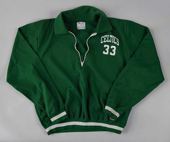 Description:Larry Bird Boston Celtics professional model/quality practice warm up jacket c.1980s (EX) Green knit pullover jacket has "Celtics 33" screened on the left chest. Champion manufacturer's tagis in the collar noting size (L). A Champion logo patch is at the bottom front tail. Light evident usage and wash wear. Uncommon style uniform piece from the Celtics Hall of Famer: EX ($400-$600)