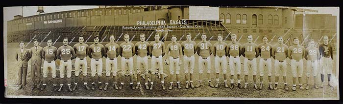 Description:Rare 1935 Philadelphia Eagles panoramic team photograph (EX) Sepia toned image measures just under 8"x27" and shows team members in full uniform on field. Each is identified by text within the print and it is likewise titled at top. Displays nicely with touch of mild toning and some scattered wear which is largely confined to edges and would general mat out when framed. Stamped "Weintraub" on back: EX ($750-$1,250)