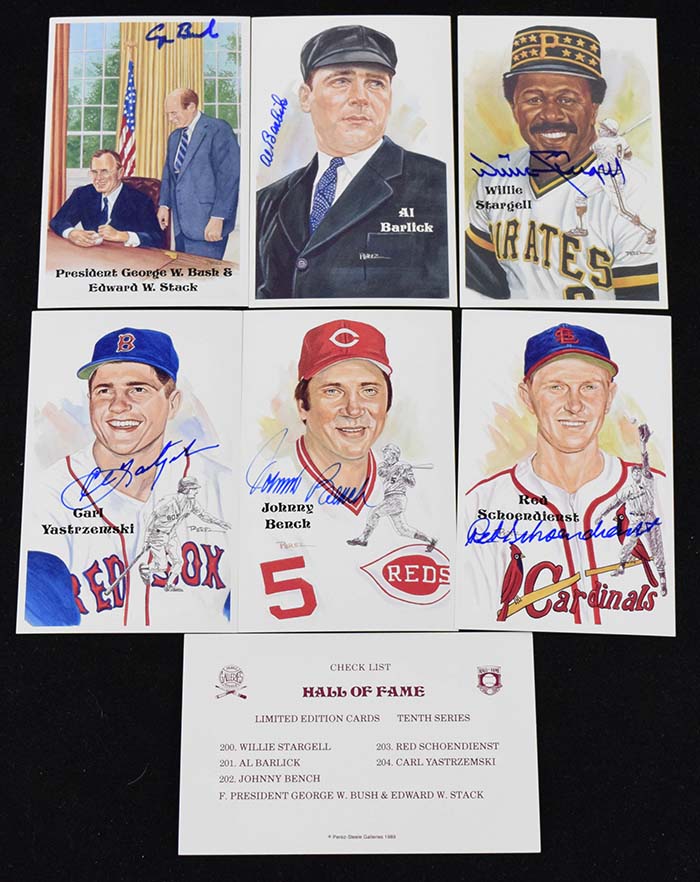 Description:Perez-Steele 10th Series art postcard set with all (6) cards signed incl. President George W. Bush (NM-MT) Limited edition set of (5) player postcards plus the George W. Bush (shown in Office signing a baseball for Hall of Fame President Edward Stack) come housed in original box with checklist card. Includes Willie Stargell, Al Barlick, Johnny Bench, Red Schoendienst, and Carl Yastrzemski, each signed in marker rating 8/9-9 out of 10. Hint of incidental handling wear: NM-MT ($300-$500)