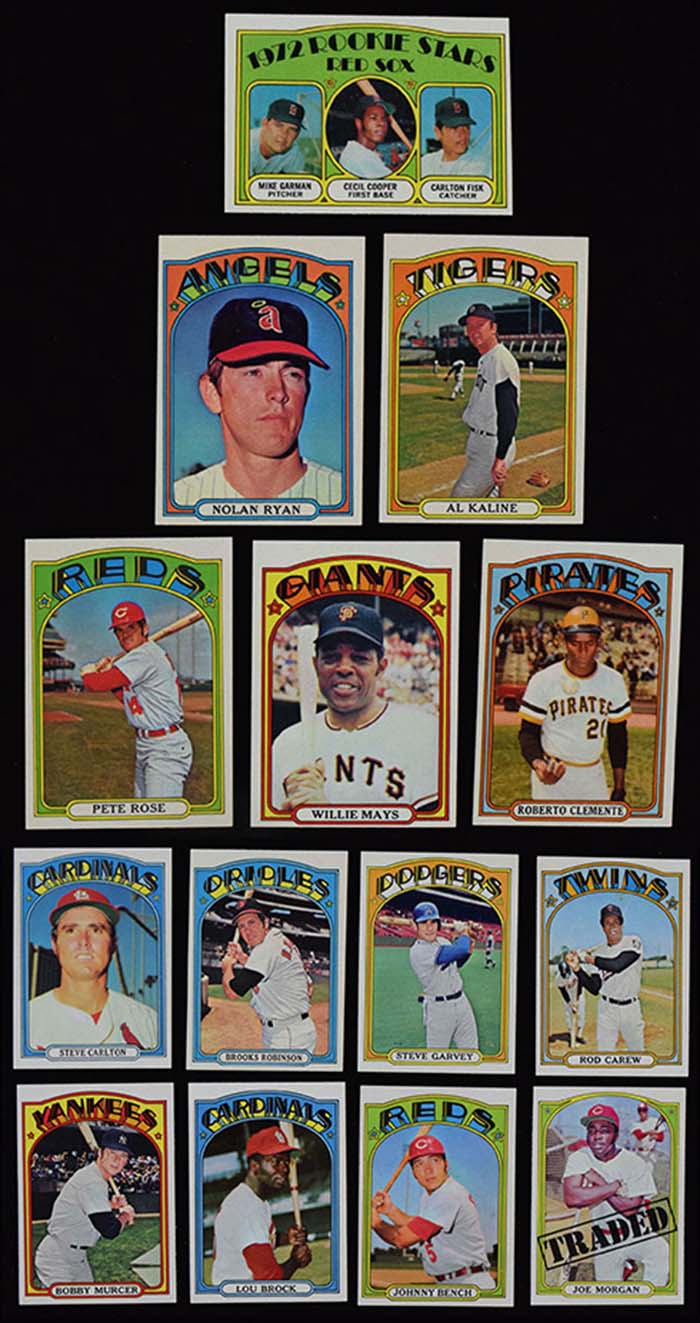 Description:Outstanding 1972 Topps Baseball complete set of (787) cards - avg. NM condition including high numbers (Range EX-MT) Very sharp set overall appears to have been carefully assembled from vending or packs. Average condition falls around NM with only a small portion falling toward lower (EX) end of stated range. Keys: #37 Yastrzemski (NM/MT very slightly OC), 49 Mays (NM/MT OC), 50 Mays IA (NM OC), 79 Fisk (EX/MT-NM OC), 299 Aaron (EX OC), 300 Aaron (NM miscut), 309 Clemente (NM/MT OC), 310 Clemente IA (NM/MT OC), 420 Carlton (NM), 433 Bench (NM/MT slightly OC), 435 Jackson (NM with small stain at upper corner), 441 Munson (EX/MT), 442 Munson IA (NM/MT), 445 Seaver (NM), 550 Robinson (NM slightly OC), 559 Rose (NM-NM/MT), 560 Rose IA (NM slightly OC), 595 Ryan (EX/MT-NM OC), 600 Kaline (NM slightly OC), 686 Garvey (NM-NM/MT), 695 Carew (NM), 699 Murcer (NM-NM/MT), 751 Carlton (NM-NM/MT OC), 752 Morgan (NM-NM/MT), 754 Robinson (NM OC), 761 Cey (NM OC): Range EX-NM ($1,000-$2,000)