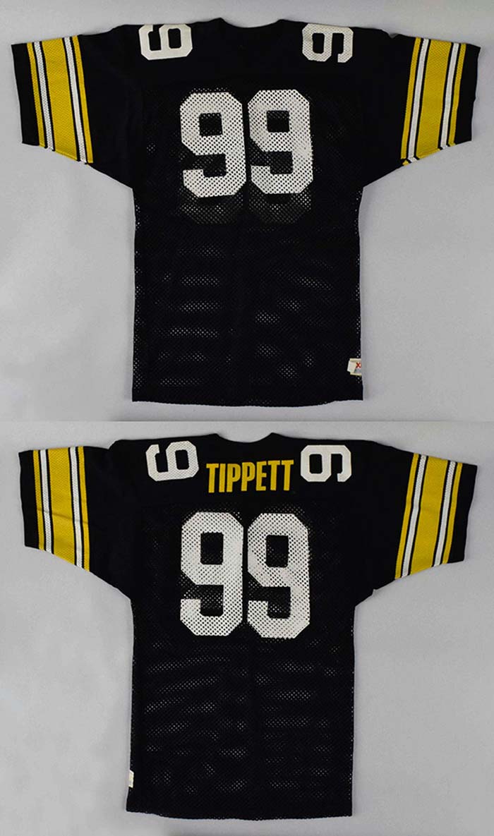 Description:Andre Tippett Iowa Hawkeyes jersey c.1980-82 (EX) Black mesh jersey with yellow and white sleeve accents has the number "99" screened on front, back, and shoulders. A "Tippett" nameplate appears on back. Champion tag on front tail notes the size (XL) and adjacent is a faded custom length tag. Touch of light usage wear with some loose nameplate stitching visible inside. Tippett was a standout player and All-American at Iowa before embarking on his Hall of Fame NFL career: EX ($500-$1,000)