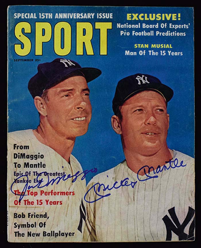 Description:Mickey Mantle and Joe DiMaggio signed 1961 issue of Sport Magazine (Sigs. NM, Magazine EX) Blue marker signatures rating 8/9 out of 10 appear on issue which has mild scattered wear: Sigs. NM, Magazine EX ($300-$500)