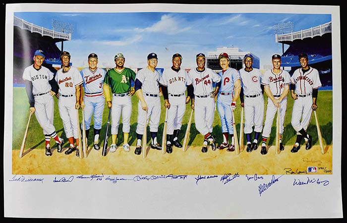 Description:500 Home Run Club autographed limited edition Ron Lewis print (NM) Large format print done on heavy stock has been signed by (11) incl. Mantle, Williams, Robinson, Killebrew, Jackson, Mays, Aaron, Schmidt, Banks, Mathews, and McCovey. Also signed by the artist and numbered out of 1,000 pieces. Marker signatures rate 8 to 9/10 out of 10. Touch of extremely minor wear mentioned for accuracy would have no effect when framed for display: NM ($750-$1,000)