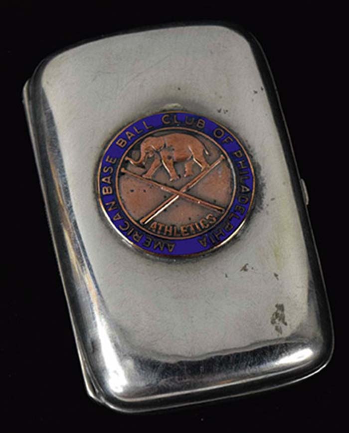 Description:c.1911 Philadelphia Athletics Sterling silver match safe (EX) Blue enameled "American Base Ball Club Of Philadelphia" Athletics team logo is mounted to front of a hinged match safe. The piece opens to reveal spring loaded arms which were designed to secure matches in either side. Mild wear throughout consistent with the intended purpose of being carried daily with some scratches and nicks. While it is unknown if this was a team issued piece, the enameled team logo portion bears a close resemblance to both the press pin and later Championship presentation medallions issued by Philadelphia for the 1911 World Series suggesting that it may relate to those same events. Further, some small surface protrusions on the crossed bats (below elephants foot) may be the result of removal of the small baseball shaped raised piece which appears on the 1911 press pin. Marked "Sterling" in two places inside. The first example we have seen or offered: EX ($1,000-$2,000)