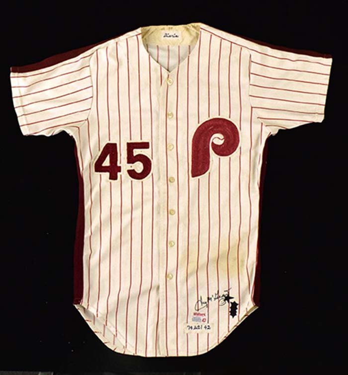 Description:Tug McGraw signed 1974 Philadelphia Phillies professional model home jersey (see description) (EX) Home pinstriped jersey with "P" logo on left front chest has number "45" on right. Number also appears on back. In the collar is an embroidered strip tag reading "Diorio" and an additional on front tail reads "74 Set 1 42." A Wilson manufacturers tag is also on front tail (noting size, 42). The jersey has been signed by Tug McGraw, whom would wear the number 45 a season later, in marker rating 8 out of 10. It displays strong usage and some general age wear. In addition, it appears that a rectangular patch has been removed from the front of the shirt and some stars have been drawn on (likely covering up some other writing). Interesting display piece: EX ($300-$500)