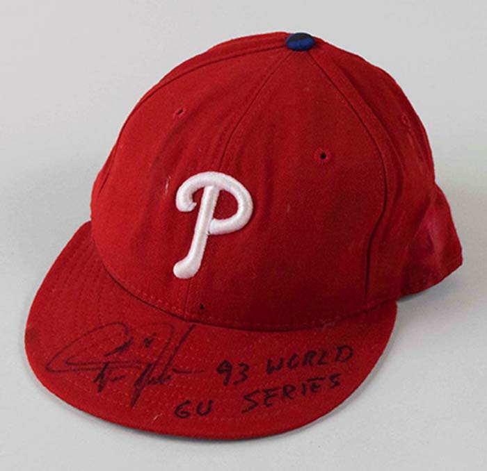 Description:Darren Daulton signed Philadelphia Phillies hat inscribed "GU 93 World Series" (Daulton COA) (EX) Red Phillies hat with white embroidered team logo has blue button accent on top. New Era 5950 tagging inside along with a size (7) tag. Signed on the brim and inscribed, "Darren Daulton GU 93 World Series" in marker rating 8 out of 10. Strong usage wear evident throughout. Includes COA which pictures the hat that has likewise been signed by Daulton: EX ($300-$500)