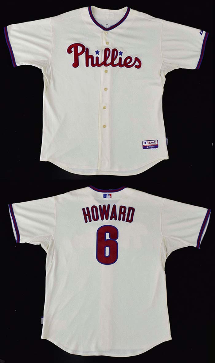 Description:2008 Ryan Howard game used Philadelphia Phillies home alternate jersey with team letter) (World Series Championship season) (EX) Cream colored alternate with "Phillies" lettered across the front has "Howard 6" on back. Majestic tag screened on front tail notes size (54) and there is a Cool Base flag tag on outer seam. Interior wash tag is coded "0063" and there is an "08" embroidered year tag on inside front tail. Usage and wash wear evident throughout and includes team issued COA confirming use during the Championship season: EX ($1,000-$2,000)