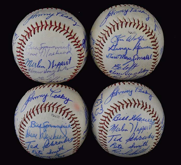 Description:Lot of (6) 1962 Seattle Rainiers team signed baseballs (Avg. EX/MT) Nice lot of team balls bearing between (21) and (23) signatures incl. Johnny Pesky on sweetspot. Ink signatures generally rate 8 to 8/9 out of 10 with a few lesser scattered throughout. Balls all display very well with off white coloration and some fading/bleed to stamped on team name. There is some additional mild surface wear/discoloration in a few cases: Avg. EX/MT