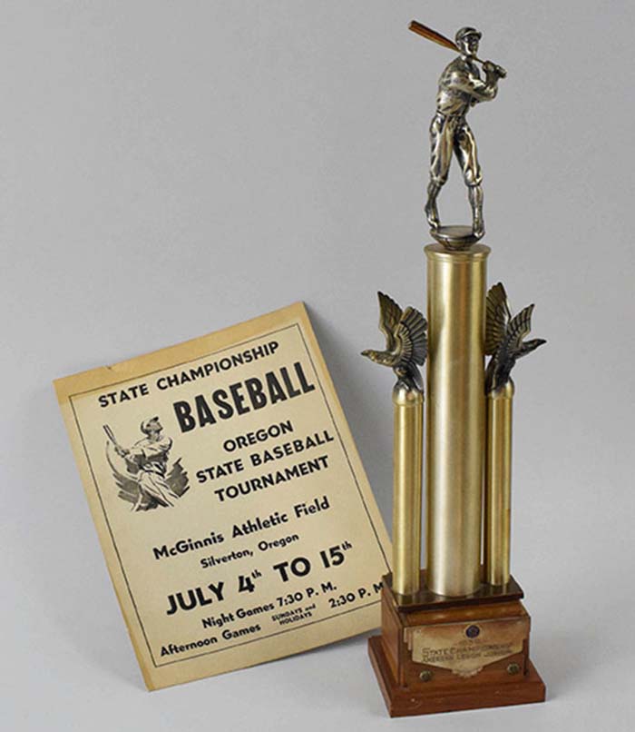 Description:1938 American Legion "State Championship" trophy (2 feet tall) with related broadside (EX) Visually appealing trophy stands nearly (2) feet tall with bat in hands of figural player at top. Metal plate affixed to base front has attached American Legion logo and is engraved "1938 State Championship American Legion Junior." Touch of light surface tarnish/wear; heavy stock 11"x14" advertising poster for "State Championship Baseball Oregon State Baseball Tournament" games. Poster has some discoloration at edges and small chip/tear at top: EX