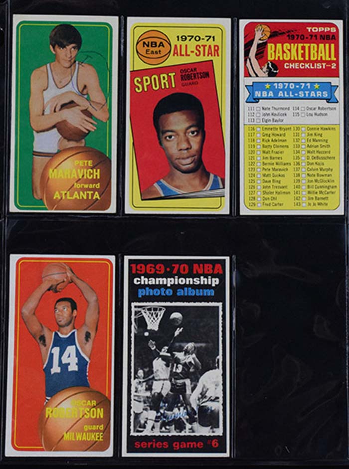 Description:1970-71 Topps Basketball partial set with many HOFers, SPs, and keys incl. Maravich (144 of 175 cards) (Range GD-NM/MT) Mixed grade group with only a handful falling near lower end of stated range and a very strong number EX/MT or better cards throughout. There are quite a few NM and some NM/MT cards (not factoring centering). Keys: #1 Leaders (VG/EX), 46 Lucas (EX/MT-NM), 65 Baylor (VG OC), 70 Hayes (NM OC), 72 Unseld (NM OC), 90 Thurmond (miscut), 93 Goodrich (NM/MT OC), 100 Robertson (EX), 101 Checklist (EX/MT-NM), 107 West (pinhole), 112 Havlicek (NM), 113 Baylor (NM OC), 114 Robertson (EX/MT-NM), 120 Frazier (EX/MT-NM, fading to back), 123 Maravich (Oc with ink writing on front and touch at corners), 137 Murphy (EX OC), 140 Cunningham (EX OC), 143 White (EX/MT OC), 150 Reed (VG), 160 West (VG), 171 West (EX-EX/MT), 173 Chamberlain (EX-EX/MT), 175 Knicks (VG): Range GD-NM/MT