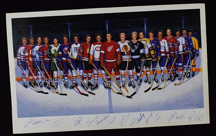 Description:500 Goal Scorers signed limited edition large format lithograph (EX/MT-NM) Oversized 23"x38" print has been signed by (17) incl. Bobby Hull, Gordie Howe, Lanny McDonald, Guy LaFleur, Phil Esposito, Stan Mikita, Maurice Richard, Mike Bossy, John Bucyk, Jean Beliveau, and others. Marker signatures rate 7/8-8 out of 10. Also signed by the artist and numbered (92/1000). Touch of light corner/edge wear would have no effect when matted and framed for display: EX/MT-NM