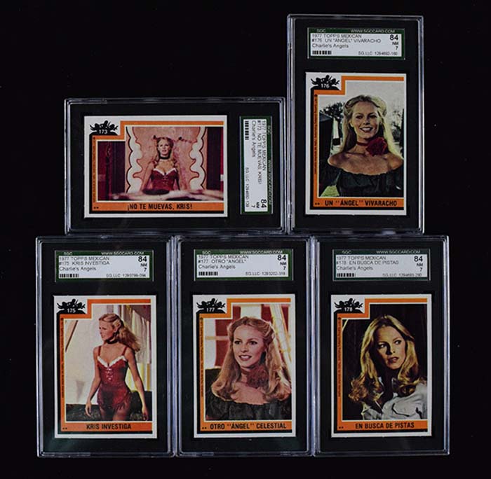 1977 Topps Mexican Charlie's Angels SGC graded NM lot of (85) cards (all SGC 84 NM) Duplication including (2) 124, (10) 125, (6) 127, (16) 128, (12) 129, 130, (3) 132, (2) 133, (2) 173, (14) 175, (5) 176, (9) 177, and (3) 178: all SGC 84 NM