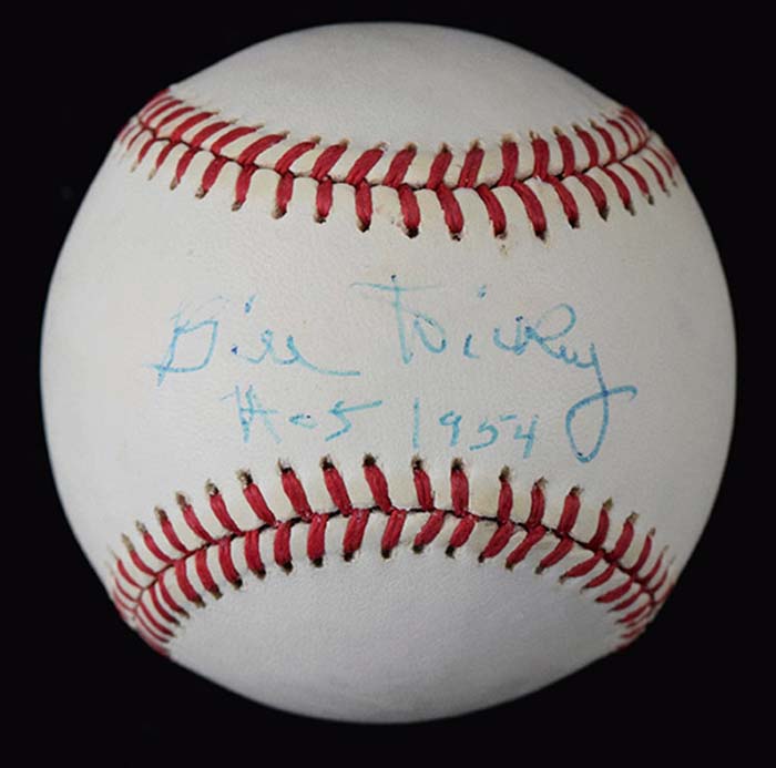 Description:Bill Dickey single signed baseball with rare HOF inscription (JSA) (EX/MT) Rawlings B.Brown OAL baseball has been signed on the sweetspot in ink rating 7 out of 10 with "HOF 1954" inscription below. Ball displays a touch of very light toning. Includes COA from JSA: EX/MT