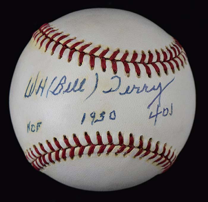 Description:Bill Terry single signed baseball with HOF and .400 inscriptions (JSA) (Sig. NM, Ball EX-EX/MT) Rawlings B.Giamatti ONL baseball has been signed by Bill Terry and inscribed HOF and 401 inscriptions below. Ink signature rates 8 out of 10. Ball displays some light/mild toning/discoloration at areas. Includes COA from JSA: Sig. NM, Ball EX-EX/MT