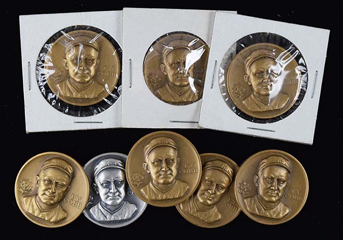Description:c.1960s Ty Cobb commemorative silver round with (14) additional done in bronze (EX/MT) Vintage commemorative pieces with Cobb likeness on front and "State of Georgia" design on back. Done by Medallic Arts in the 1960s. One is marked ".999 Fine Silver", others are struck in bronze. Touch of light wear: EX/MT