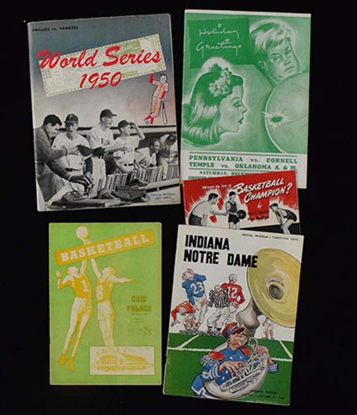 Description:Interesting lot of vintage 1940s-50s mixed sports programs incl. 1950 World Series and 40s college basketball (Range VG-EX/MT) Includes 1950 World Series program (at Philadelphia, VG/EX); (7) 1940s College basketball programs incl. notable schools highlighted by Penn State, Temple, St. Joe's, Cornell, and others. Also includes (1) 1952 program for La Salle Eastern Kentucky and Temple Duke games; vintage "Want To Be A Basketball Champion?" publication; 1950 Indiana vs. Notre Dame football program; and 1956 Maccabi Soccer Club of Tel Aviv vs. Philadelphia Uhrik Truckers program. Varying degrees of wear throughout: Range VG-EX/MT