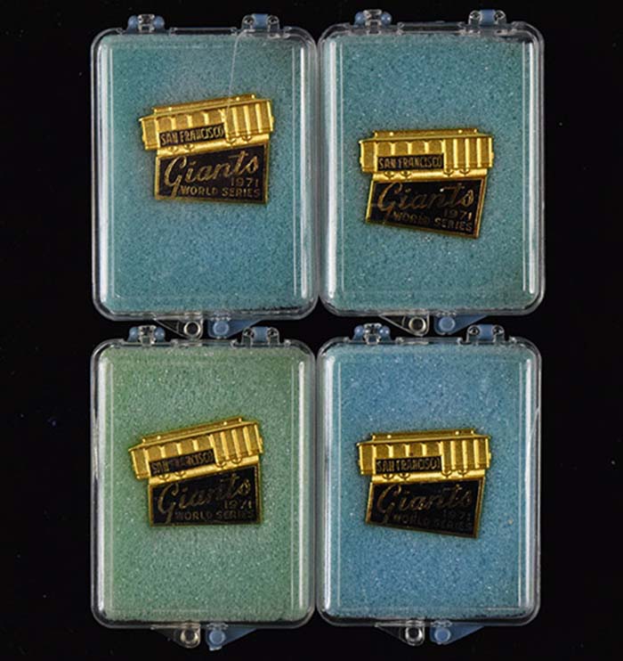 Description:Lot of (4) 1971 San Francisco Giants World Series phantom press pins (NM) Four pins in original boxes as issued showing no mentionable wear (light wear to boxes): NM