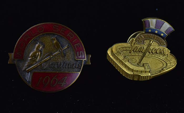 Description:1964 New York Yankees and St. Louis Cardinals World Series press pins (EX/MT) Original pins with a touch of light wear. Cardinals pin is missing screw down closure: EX/MT