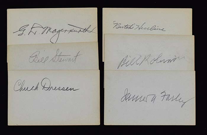 Description:Lot of (17) vintage signed index cards incl. baseball, political, and Bojangles Robinson (EX/MT) Includes entertainer Bill Bojangles Robinson; Postmaster James Farley; Politicians Thomas E Dewey and Jimmy Walker; (2) Chuck Dressen, Bill Stewart, George Magerkurth, Steve O'Neill, Lou Jorda, Tom Dunn, Butch Henline, Buster Mills, George Barr, Red Schoendienst (skip to first name), and Al Helfer (Broadcaster); Charlie Grimm signature on card which is taped to index card; unidentifier signature which has notation on back "Chicago Sports Writer & Author." Ink and pencil signatures rate 7 to 8/9 out of 10, cards have light/mild toning: EX/MT