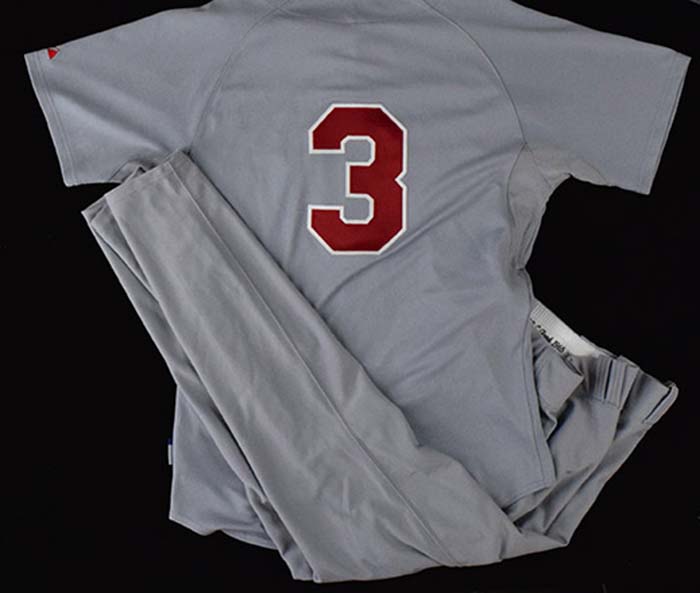 Description:April 10, 2010 Ross Gload game worn Philadelphia Phillies throwback uniform (MLB Authentication) (EX) Road uniform done in 1965 style as worn during the game played vs. Houston. Jersey has "Phillies" lettered across the front and number "3" on back. Majestic tag screened on front tail notes size (46) and an 63TB coded wash tag is inside. Pants are likewise by Majestic with lengthy strip tag in waist reading "37-47 33 OB C Gload 1965." Each piece has MLB Authentication hologram affixed which confirms game use: EX