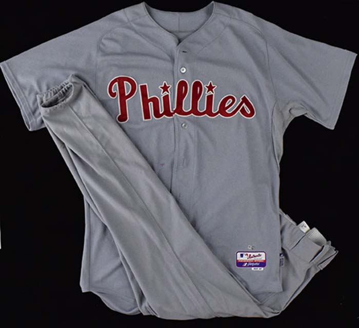 Description:April 10, 2010 Pete Mackanin game worn Philadelphia Phillies throwback uniform (Coach) (MLB Authentication) (EX) Road uniform done in 1965 style as worn during the game played vs. Houston. Jersey has "Phillies" lettered across the front and number "22" on back. Majestic tag screened on front tail notes size (48) and an 63TB coded wash tag is inside. Pants are likewise by Majestic with lengthy strip tag in waist reading "36-40 34 Macanin 1965." Each piece has MLB Authentication hologram affixed which confirms game use: EX
