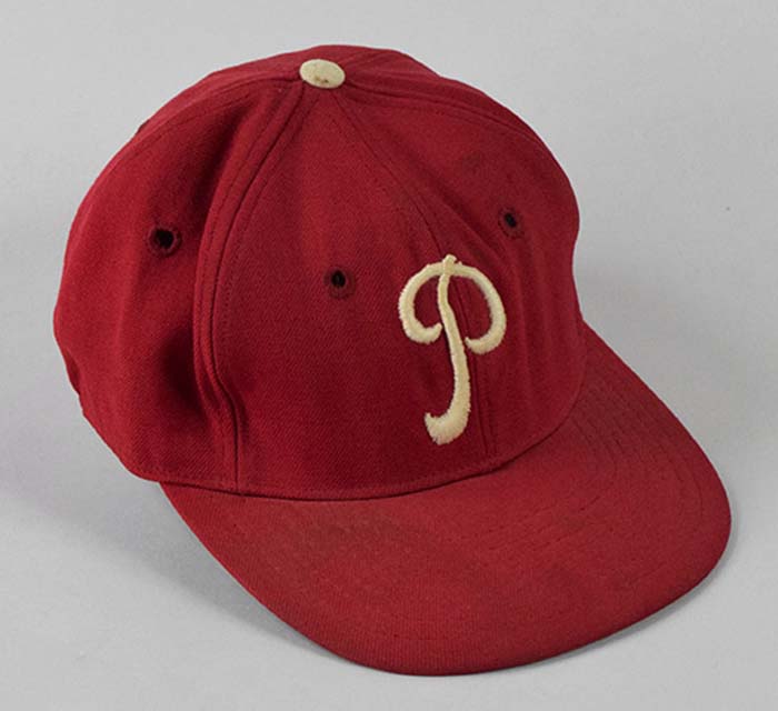 Description:Vintage Philadelphia Phillies professional model hat c.1960s (EX) Nice example remains well preserved for display with "Tim McAuliffe" label on interior leather band. Band also has KM Pro Cap and size (7 1/8) stampings. Usage wear throughout with some minor general age wear. Small hole in one side: EX